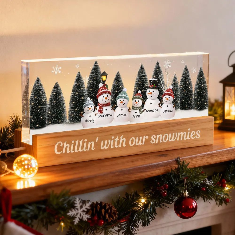 LED-lysplakett med personlig snømannfamilie, varmt lysende nattbordsdekorasjon, koselig vinterminne, unik julegave til familien