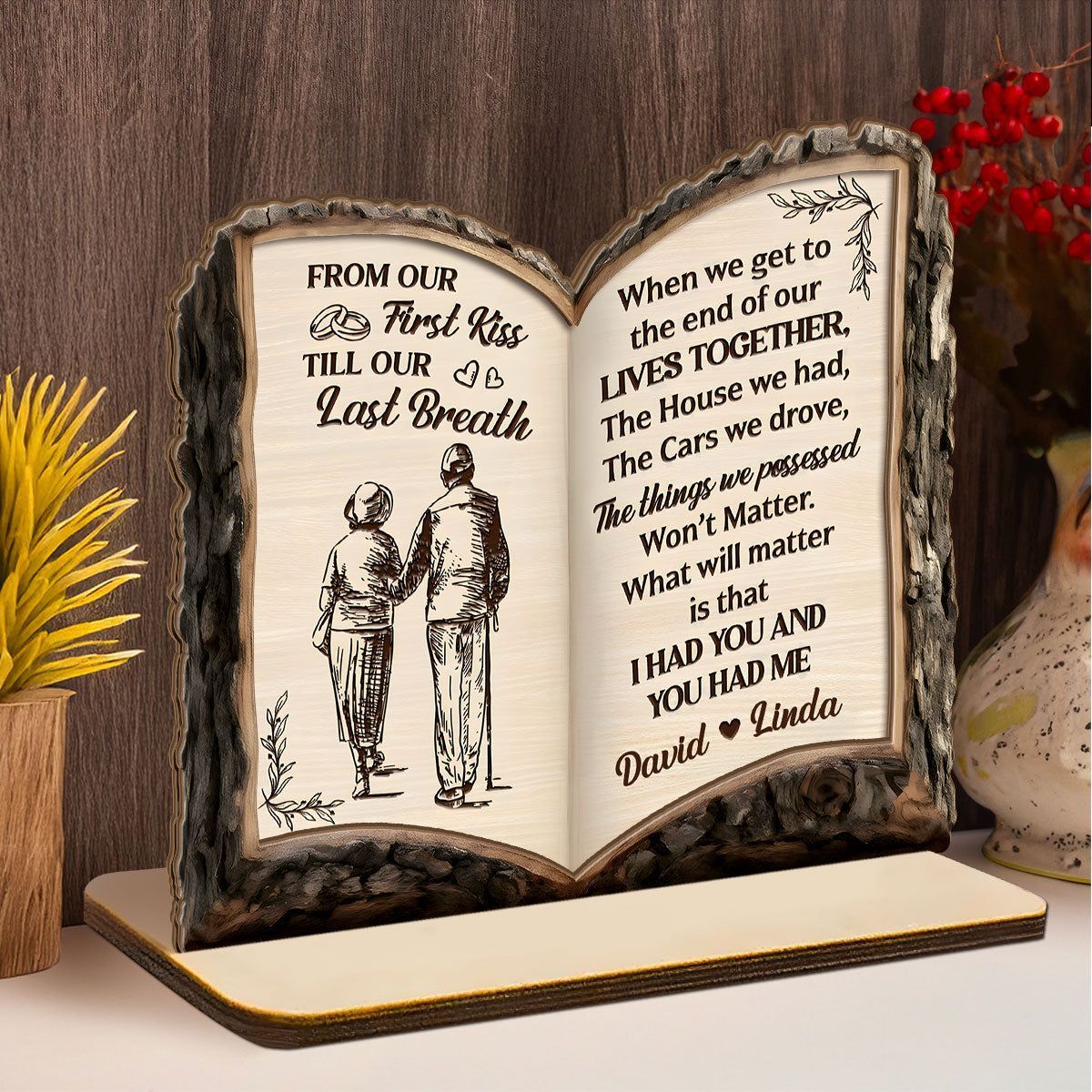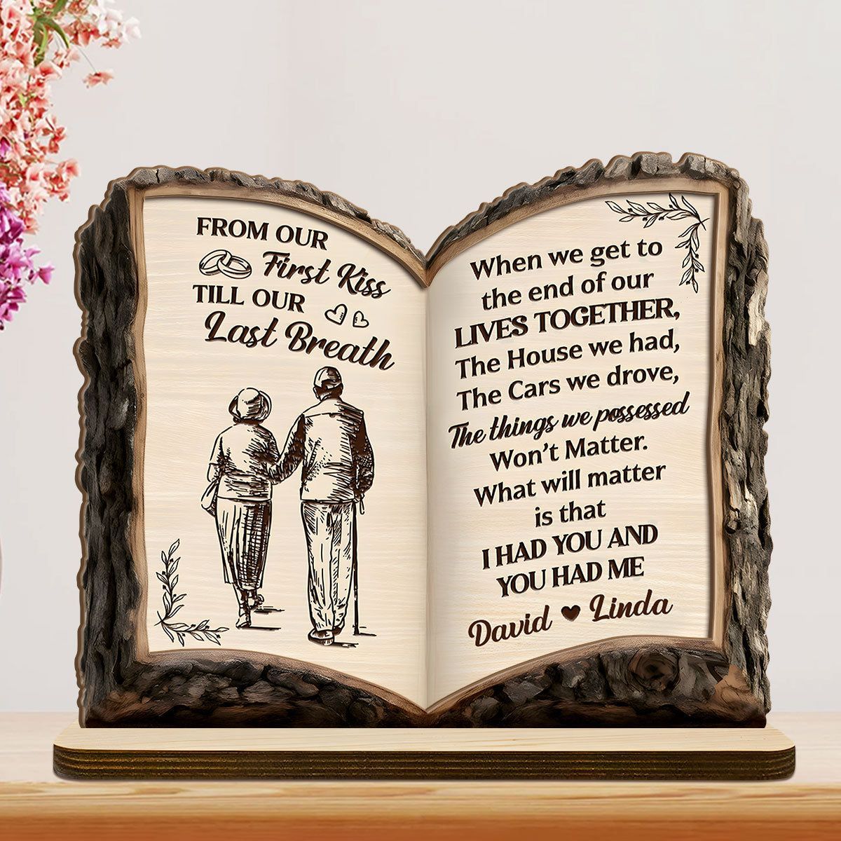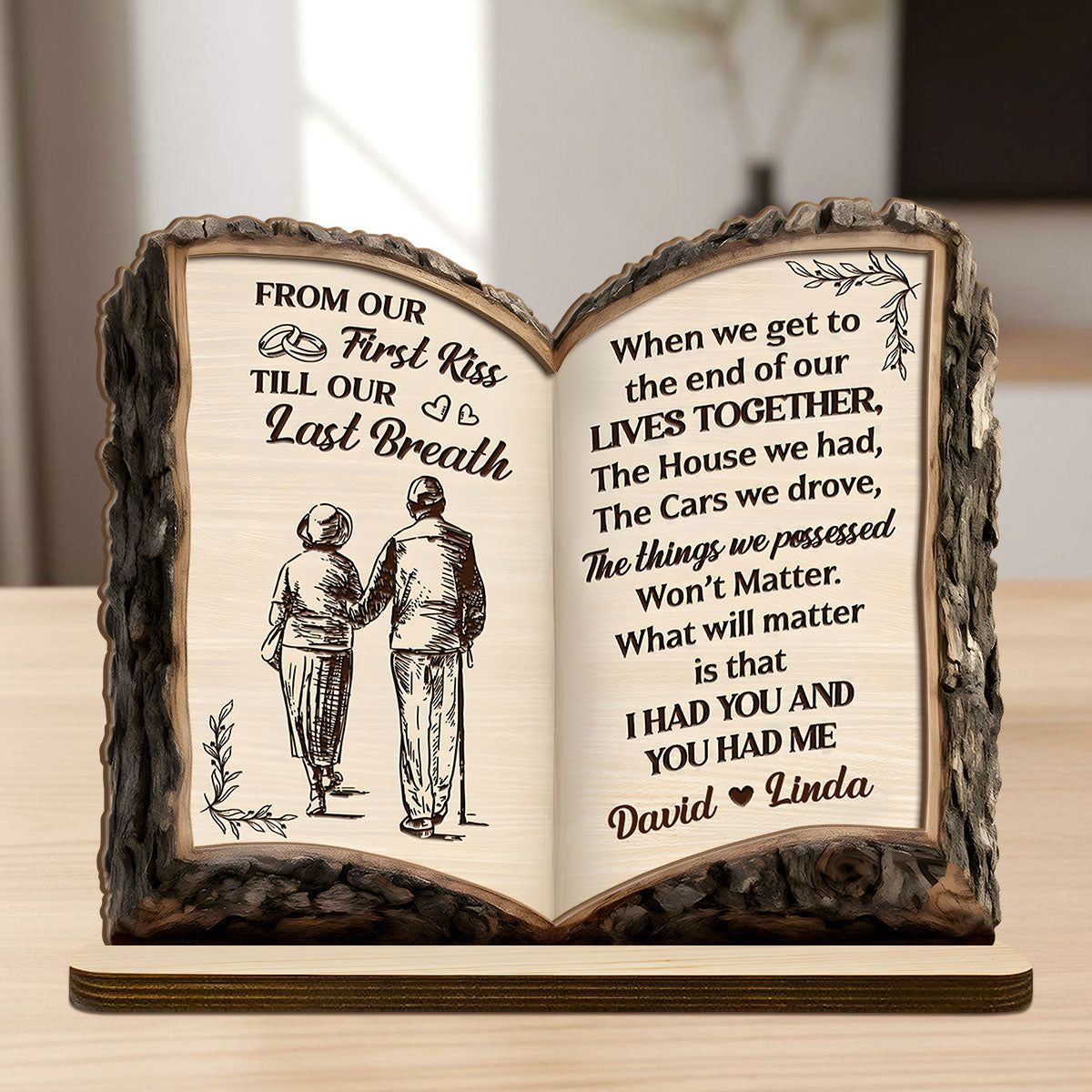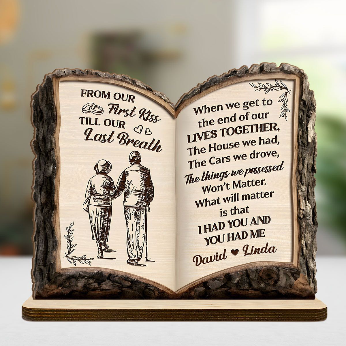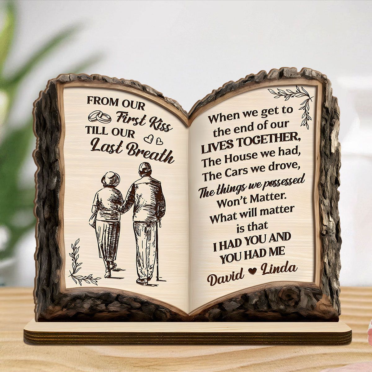 Fra vårt første kyss til vårt siste åndedrag – kjærlighetsreise-bok – personlig 2-lags treplakett med flat base