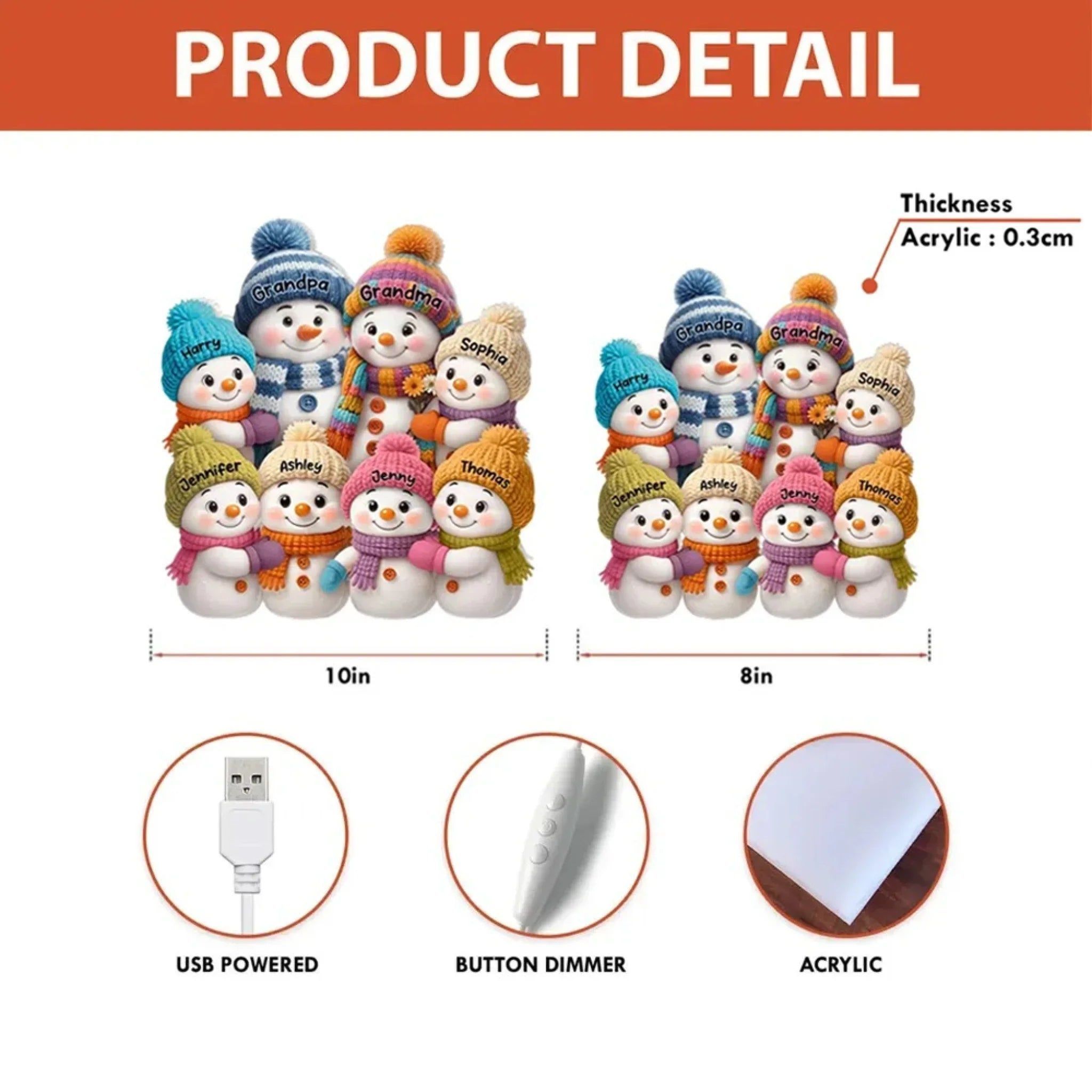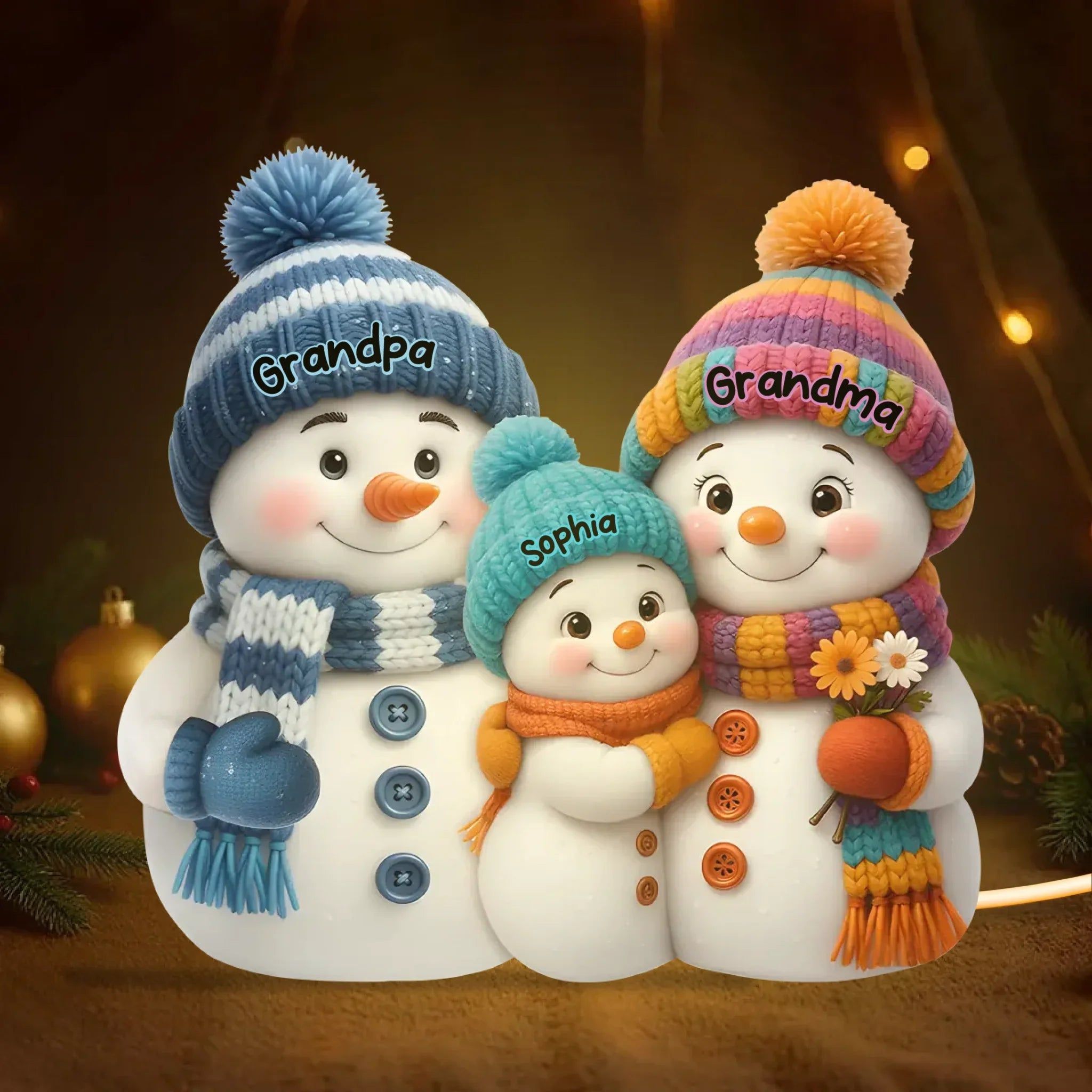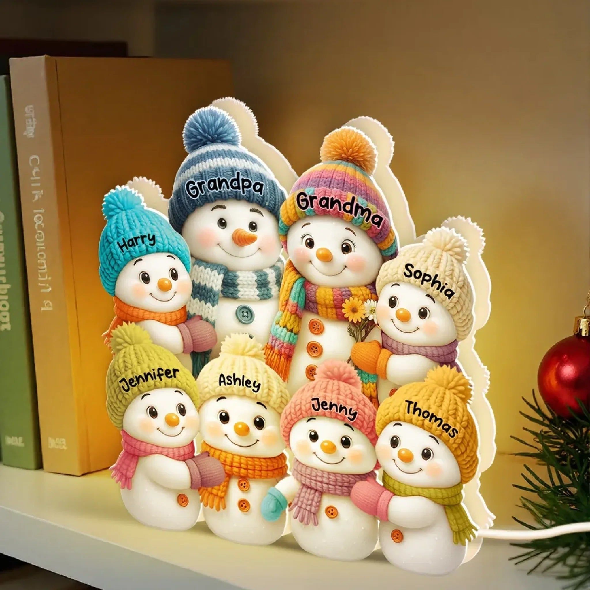Snømann Bestemor Bestefar og Barnebarn Personlig Lysboks - Julegave til Besteforeldre - 3D-Effekt Lysboks